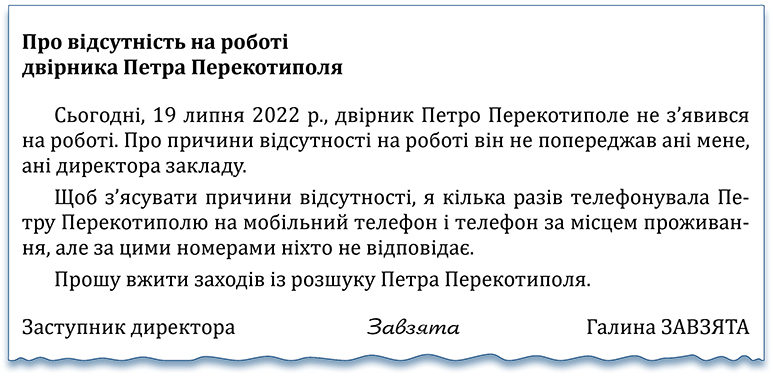 Скеруйте безпосереднього керівника працівника скласти доповідну записку про його відсутність на роботі: