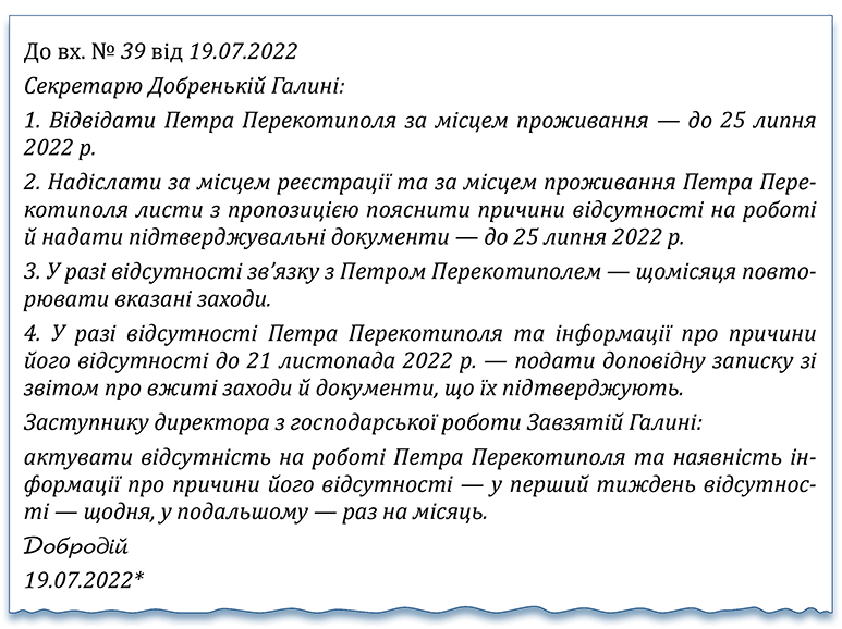 Ви як керівник закладу ухвалюєте рішення про додаткові заходи. Після того як розглянете доповідну записку безпосереднього керівника відсутнього працівника, маєте ухвалити рішення про розслідування причин відсутності працівника на роботі та визначити виконавців розслідування — безпосередній керівник відсутнього працівника, секретар, один із заступників керівника закладу тощо. Рішення оформлюйте у вигляді резолюції на доповідній записці керівника працівника: