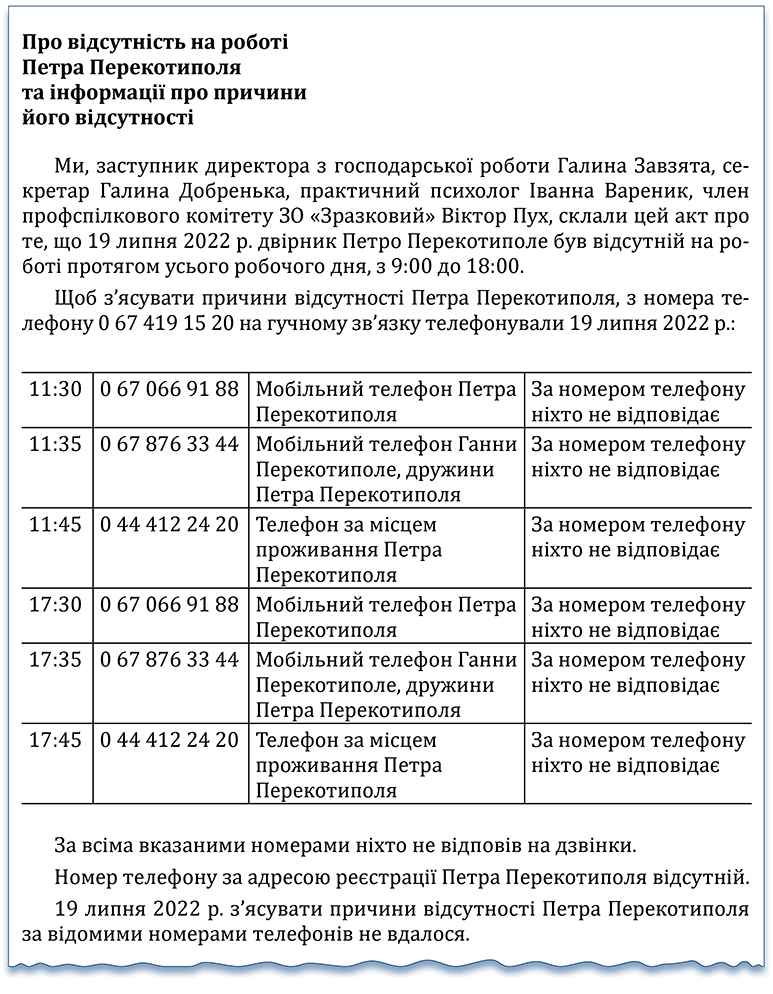 Якщо працівник не з’являється на роботі, не відповідає за номерами телефонів, зазначеними в картці П-2, а родичі не можуть пояснити, де він, — керуйтеся алгоритмом.