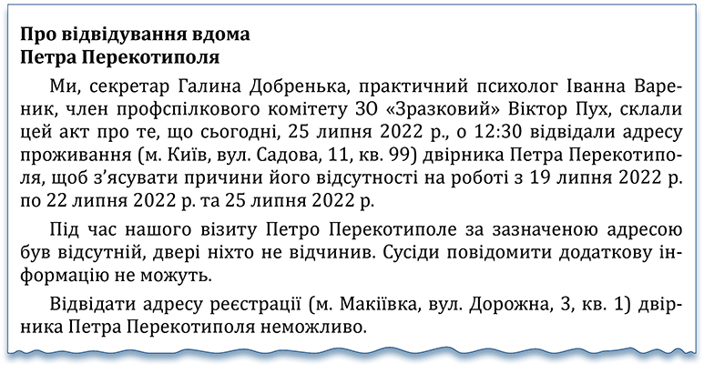 В умовах воєнного стану доречно розшукувати працівника за місцем проживання або реєстрації тільки у випадку, якщо заклад освіти розташований на безпечній території. Результати візиту оформте актом: