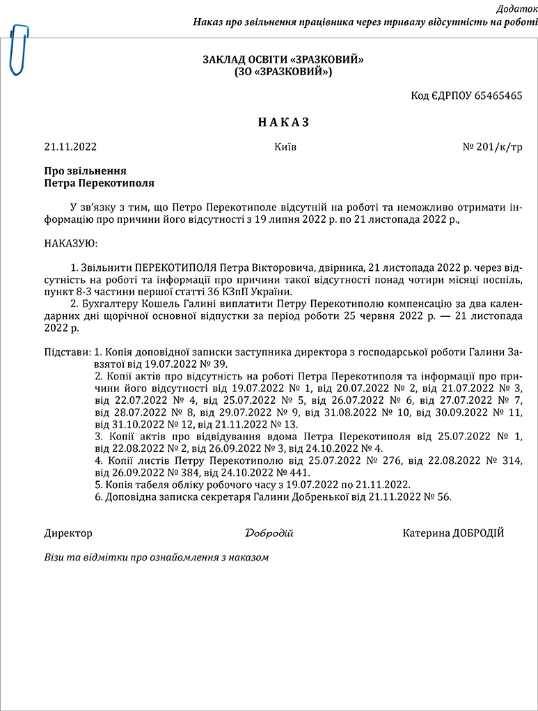 Також надішліть працівнику фото наказу про звільнення й повідомлення про необхідність отримати трудову книжку всіма можливими способами — на електронну пошту, у вайбер чи інший месенджер тощо. Зробіть скрин і роздрукуйте.
